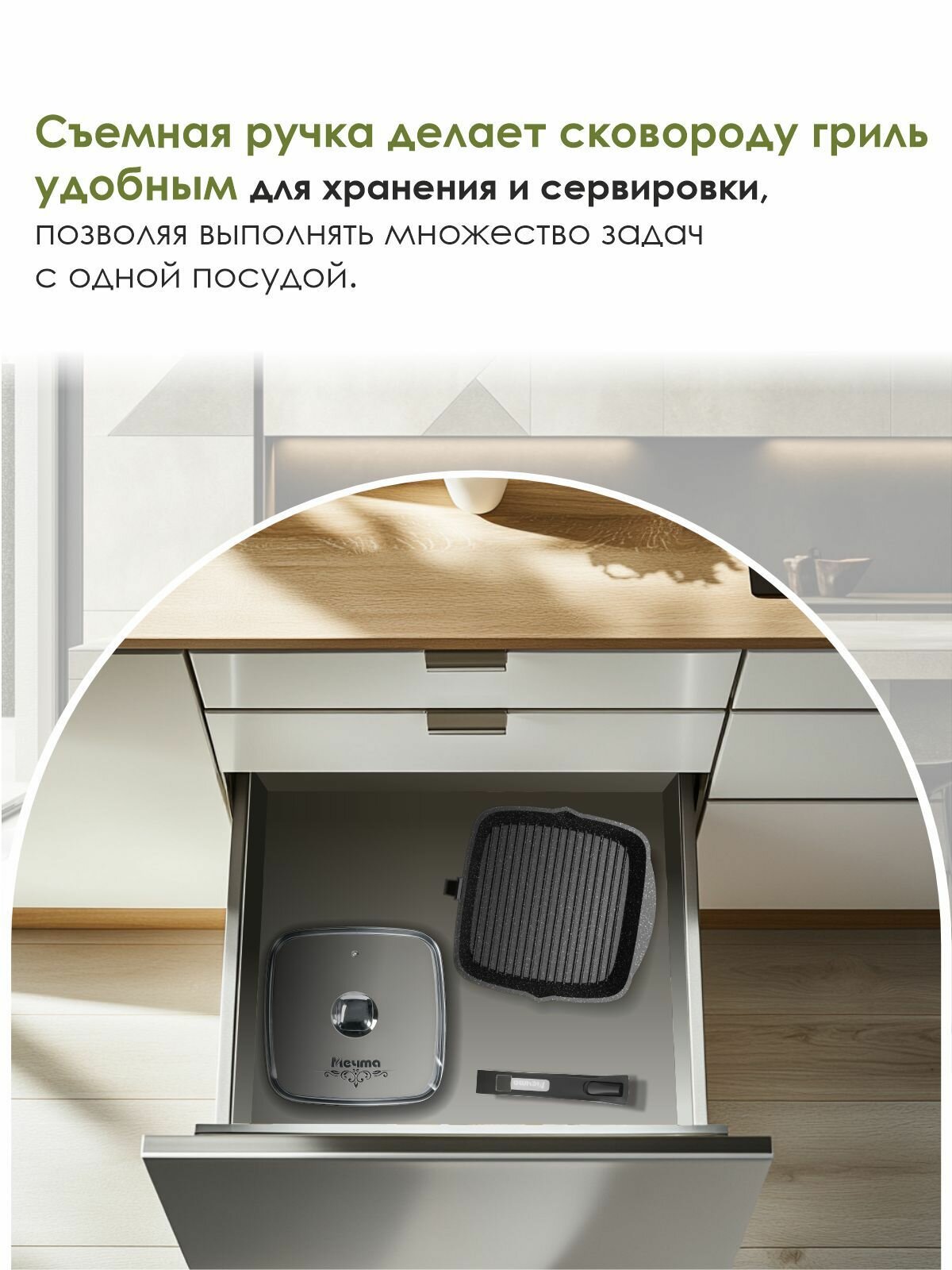 Сковорода гриль антипригарная 28 см квадратная с крышкой и съемной ручкой, Мечта
