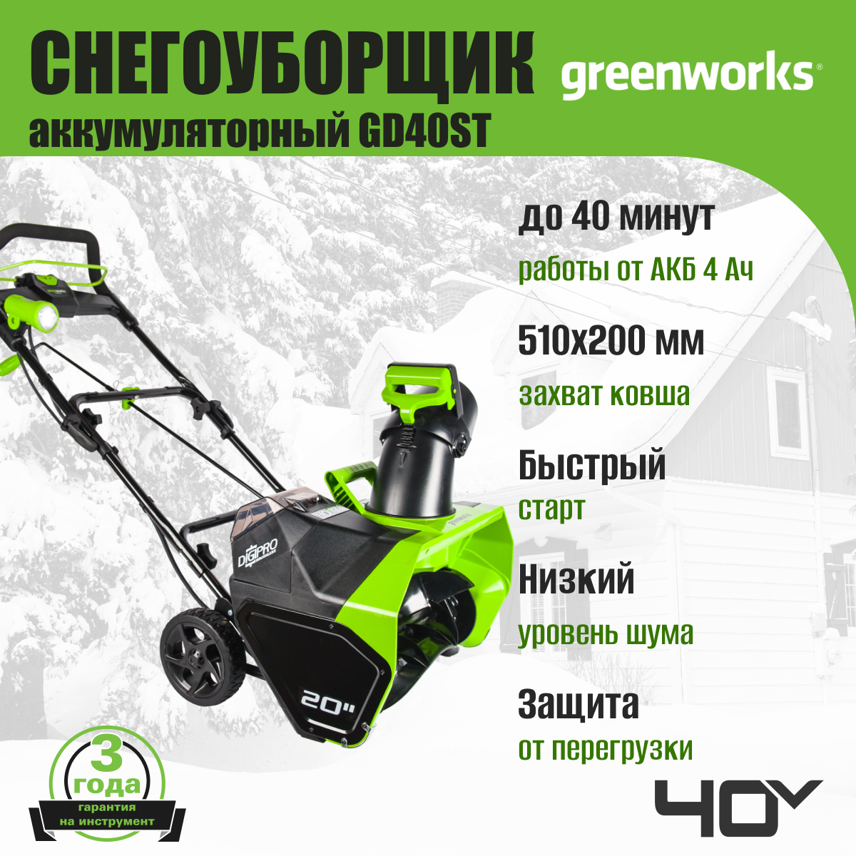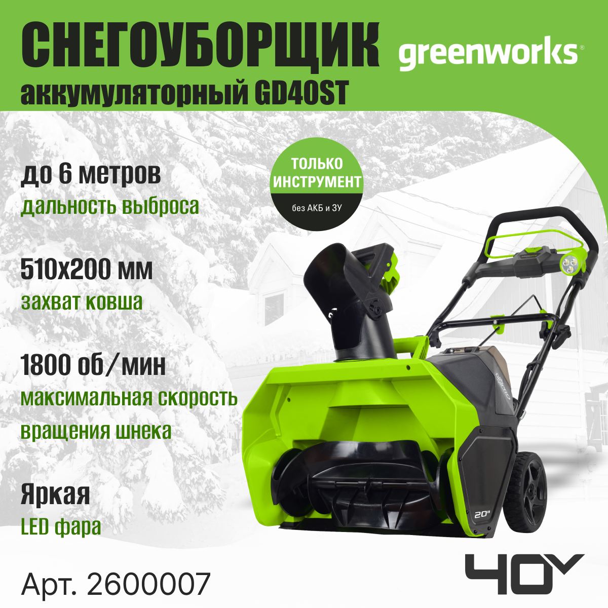 Снегоуборщик GREENWORKS GD40ST, аккумуляторный, без АКБ, без ЗУ [2600007]