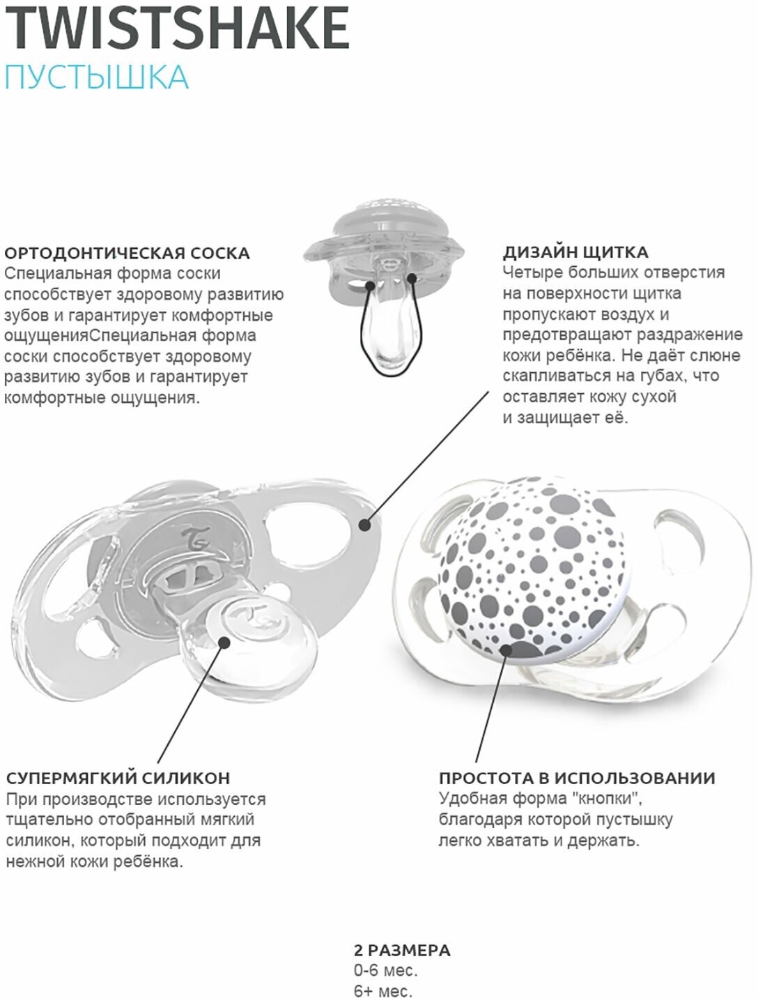 Соска пустышка 0-6 мес. ортодонтическая, Twistshake, набор 2 шт. (серая и белая)