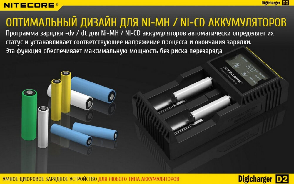 Nitecore Зарядные устройства d2 18650/16340 на 2 акб intellicharge v2 совместим с li-ion и ni-mh/ni-cd аккумуляторами с автоматическим определением 11479