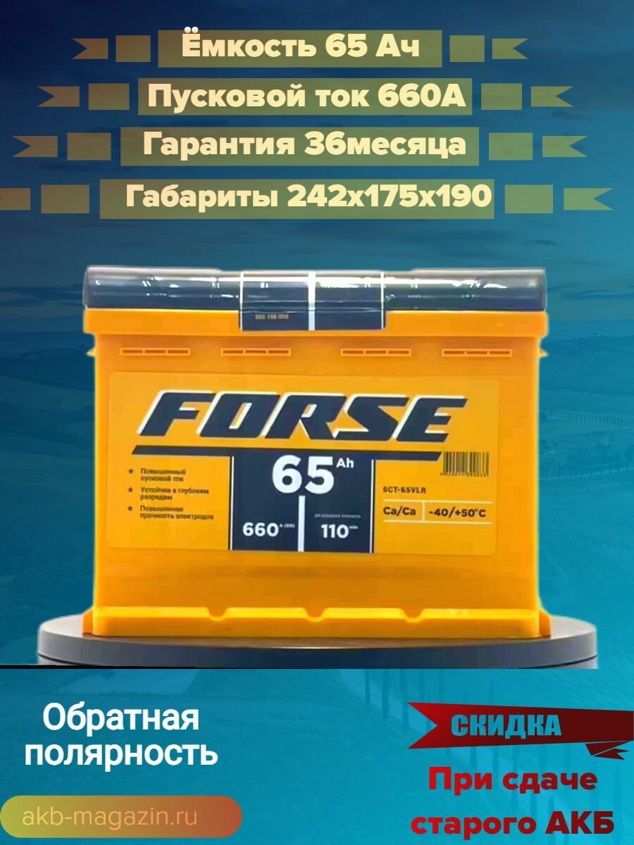 Автомобильный аккумулятор премиум класса FORSE 6ст- 65 VL прямая полярность