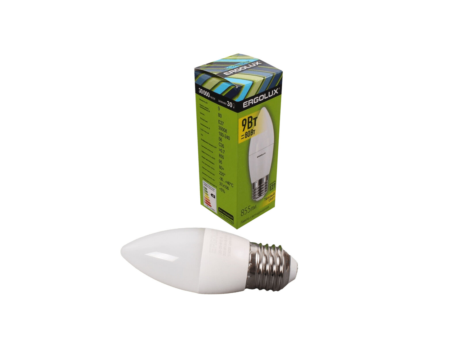 Электрическая светодиодная лампа Ergolux LED-C35-9W-E27-3K Свеча 9Вт E27 3000K 172-265В 13170