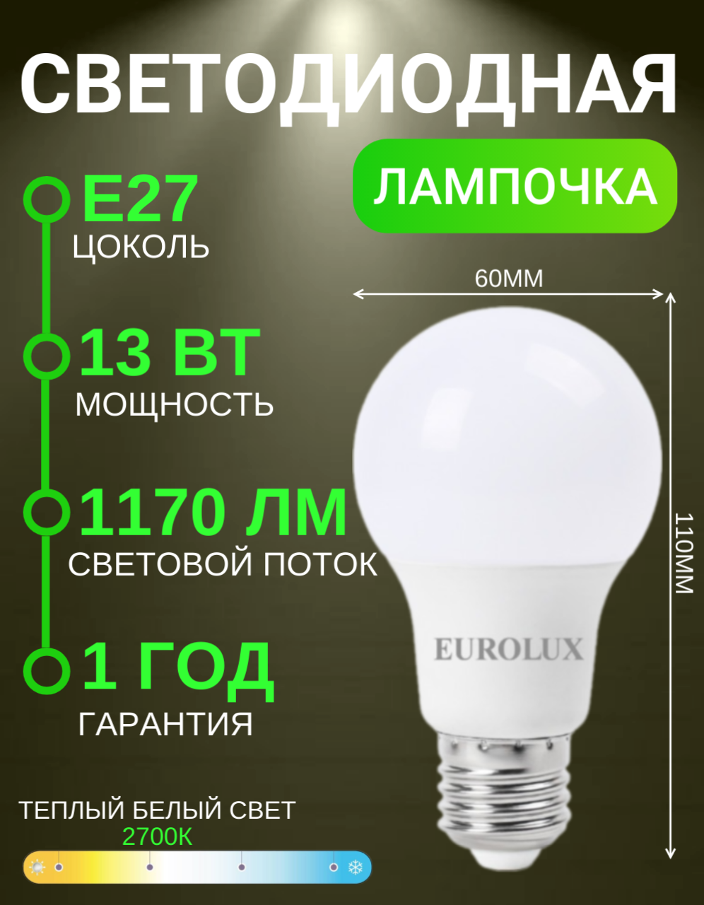 СохранитьЛампа светодиодная LL-E-A60-13W-230-2,7K-E27 (груша, 13Вт, тепл., Е27) Eurolux интересное: