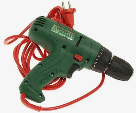| Плюсы: | Мощности хватает,большие шурупы крутит.провод длинный. |