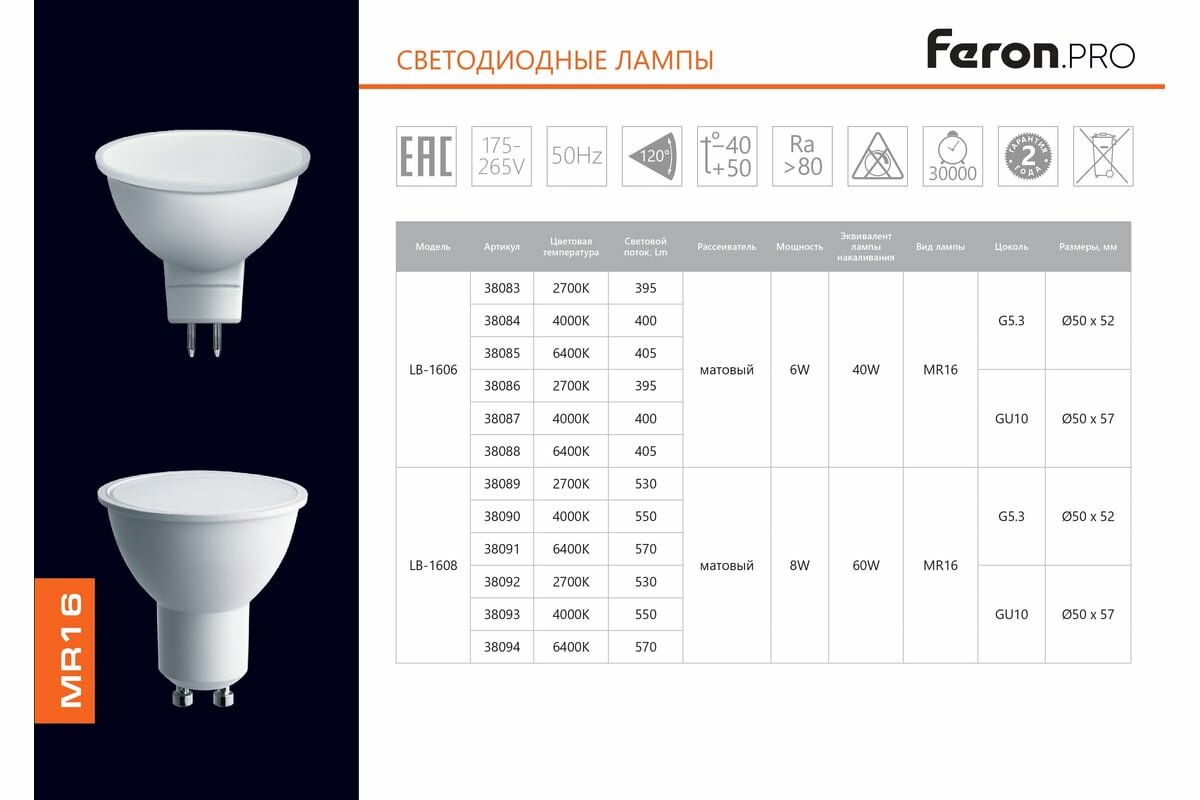 Лампа светодиодная .PRO LB-1607 GU10 7W 6400K, FERON 38178 (1 шт.)