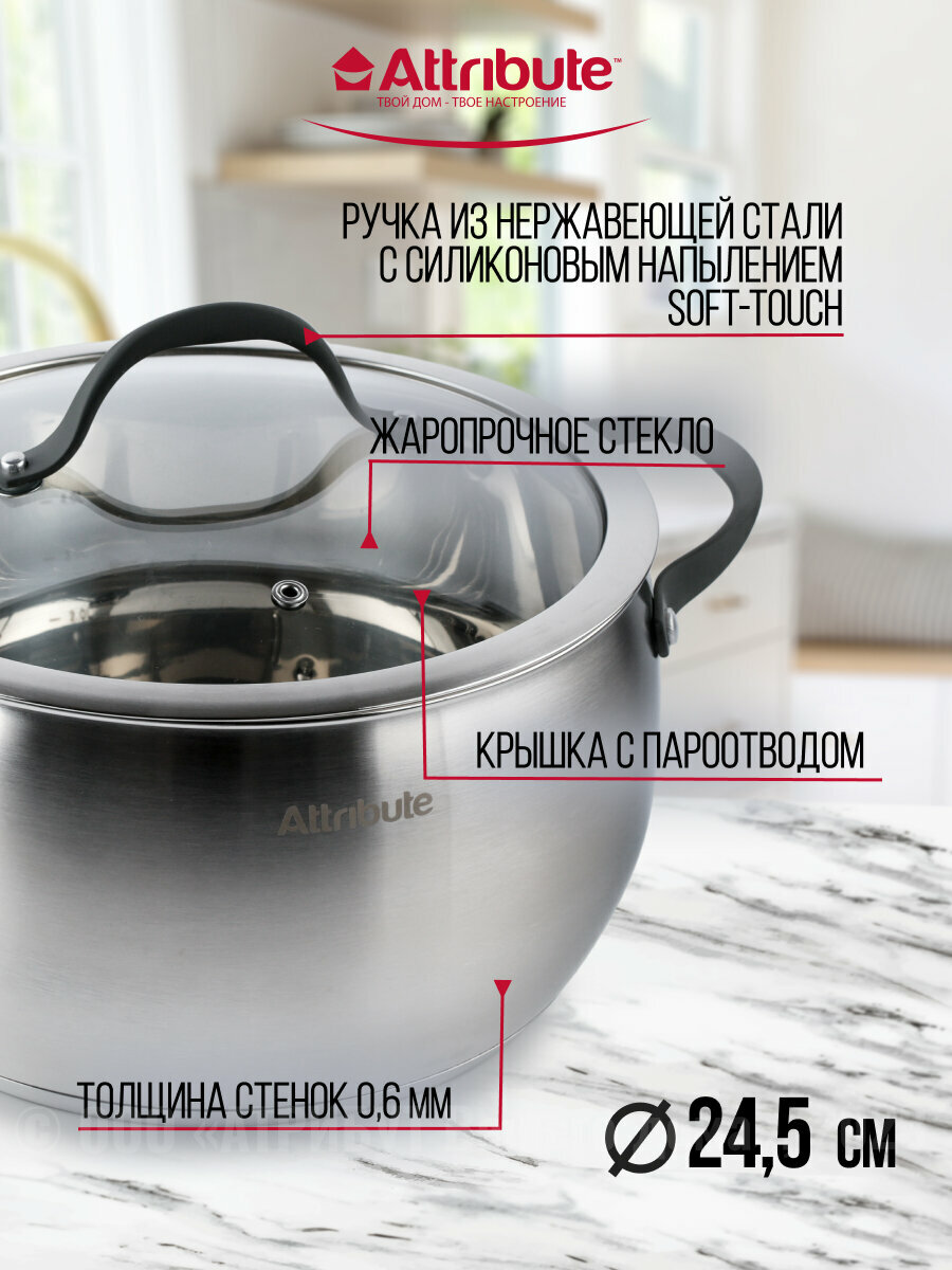 Кастрюля ATTRIBUTE Symphony 6,2л 24см нерж.сталь стеклянная крышка индукция