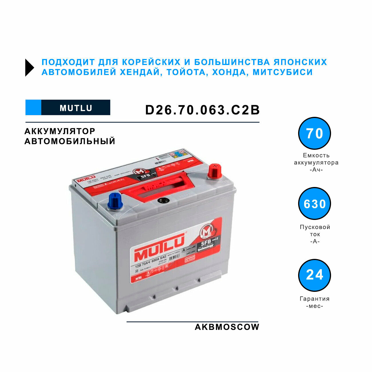 MUTLU D26.70.063.C Аккумулятор MUTLU SFB JIS 70 А/ч обратная R+ 260x173x225 EN630 А
