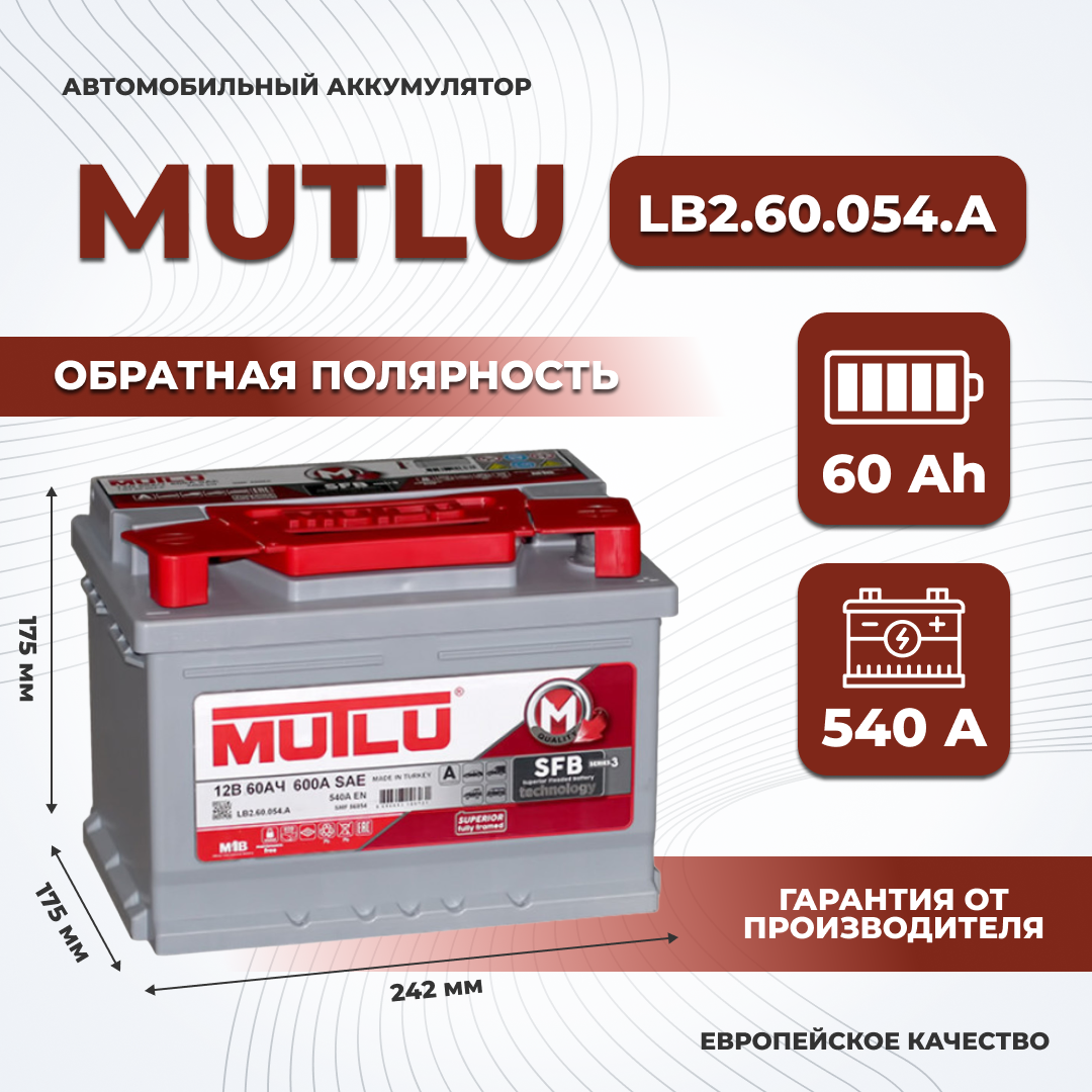 Аккумулятор Mutlu Sfb 60 А/Ч Обратная R En 540a 242x175x175 Smf56054 Lb2.60.054.A Mutlu арт. LB260054A