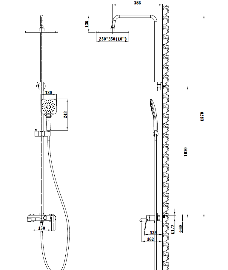 | Комплектация | верхний душ / лейка / шланг / держатель для лейки / душевая штанга / излив / переключатель потоков / Смеситель |