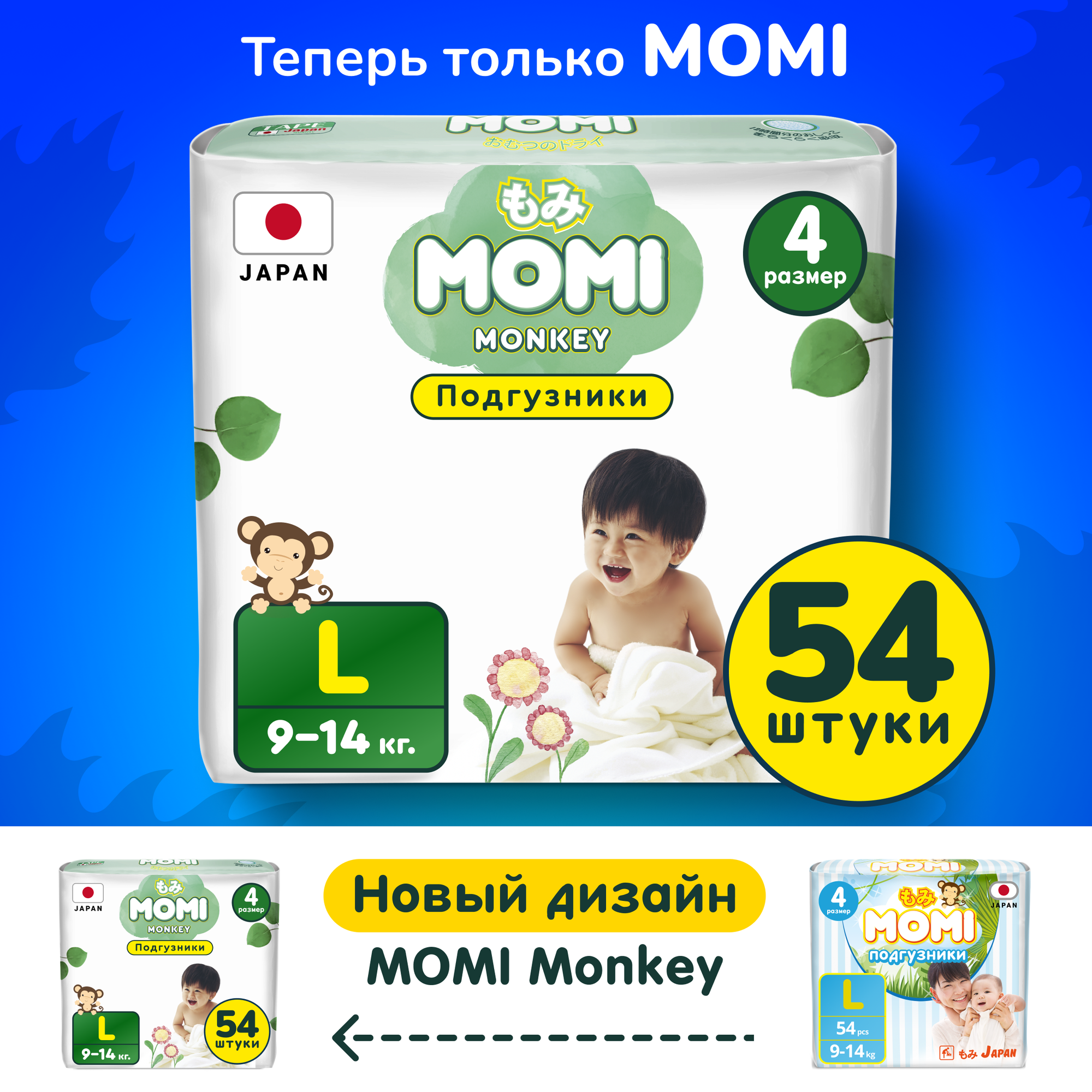 Momi MONKEY японские подгузники детские 9-14 кг, размер 4 L, 54 шт