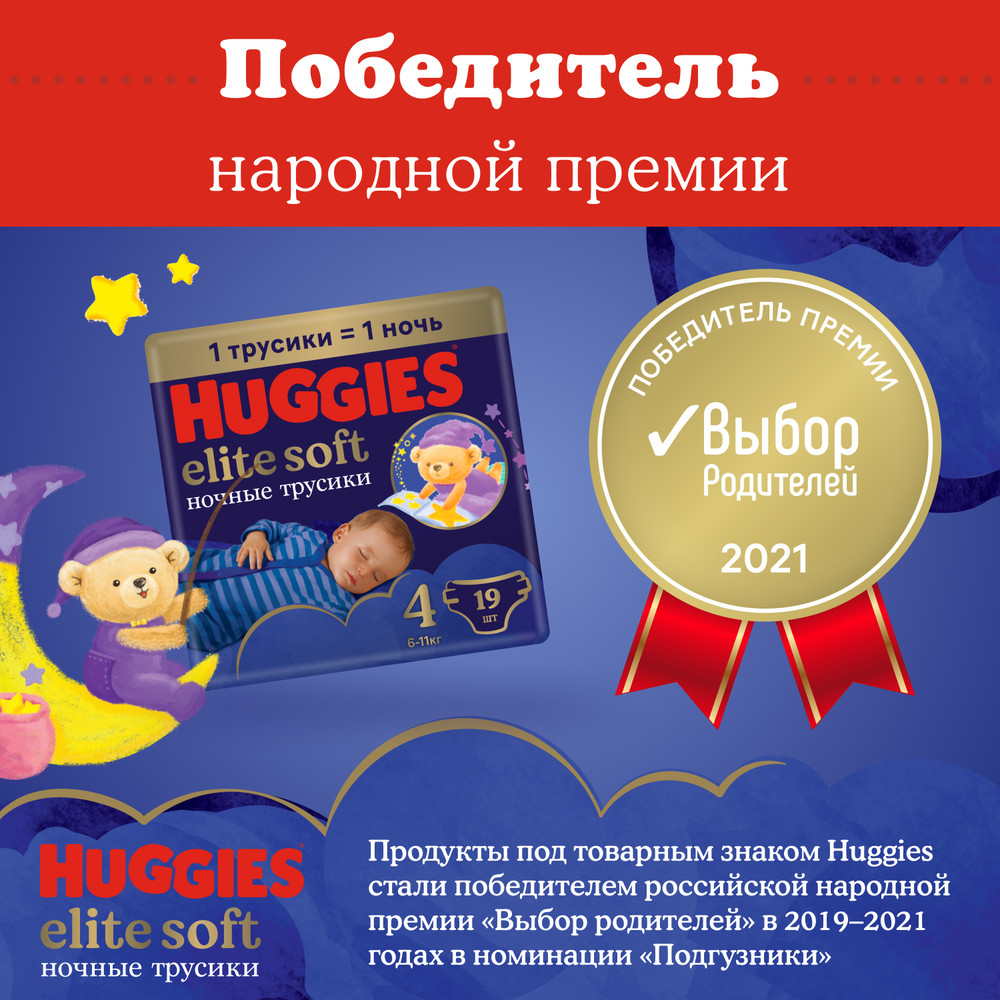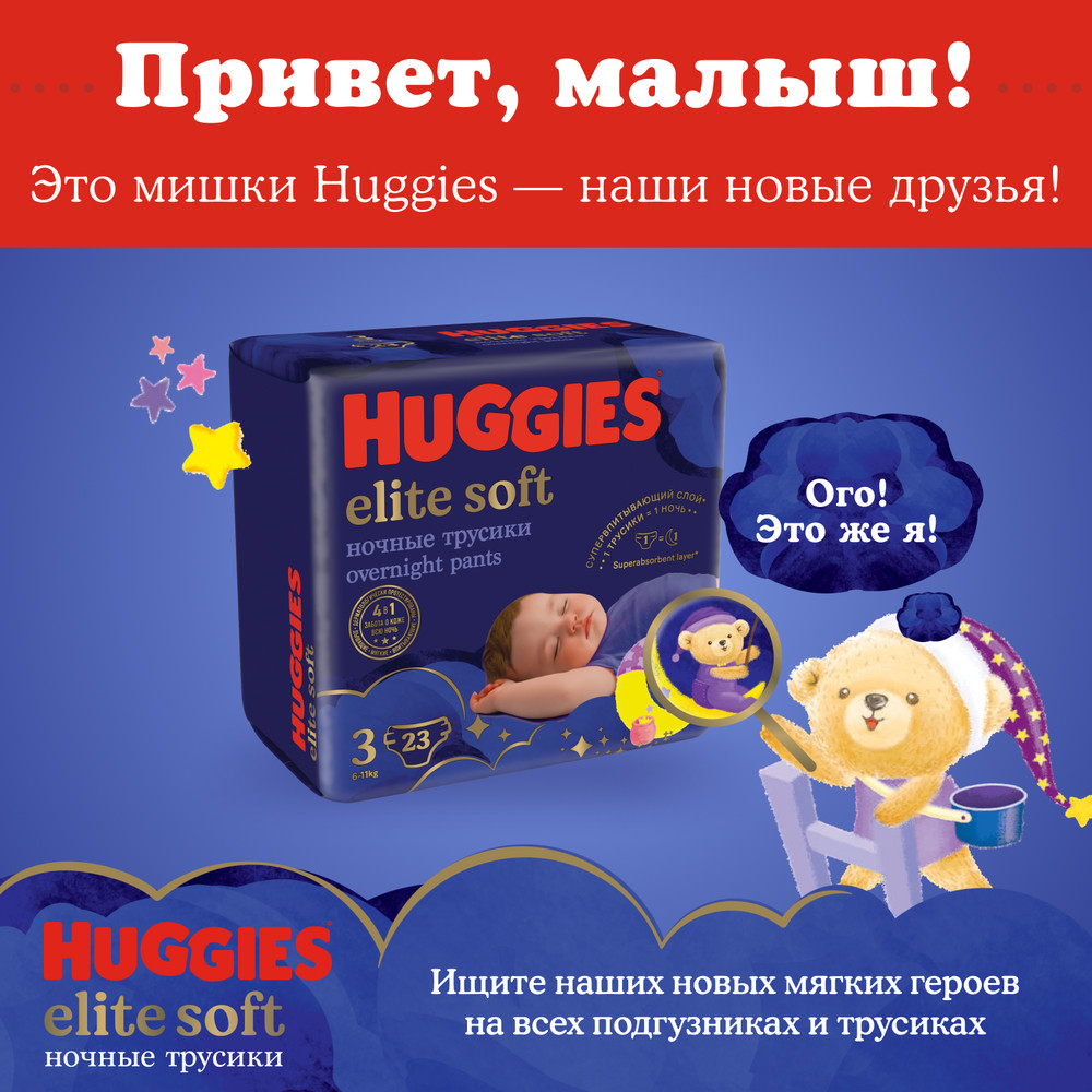 СохранитьНочные трусики-подгузники Huggies Elite Soft 3 (6-11кг) 23 шт интересное: