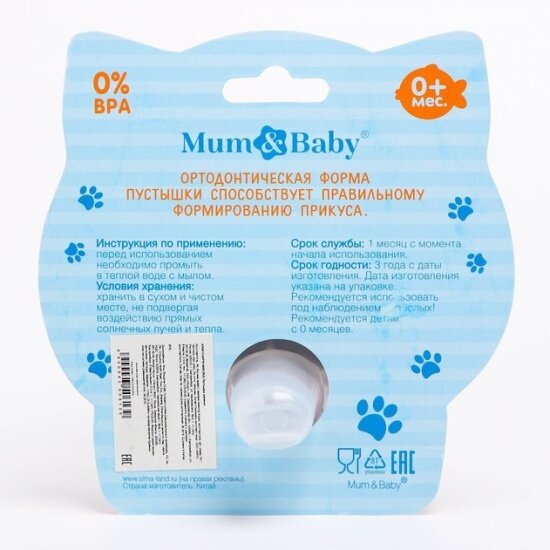 Пустышка силиконовая ортодонтическая Котик,от 0 мес., с колпачком Mum&Baby 4350613