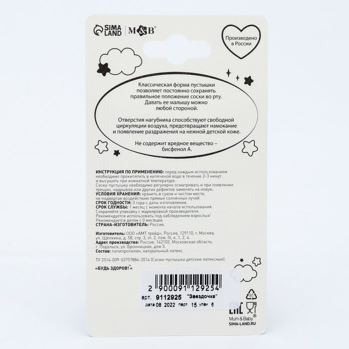 Mum&Baby Соска-пустышка классическая, от 0 мес., латекс, "Звездочка" интересное: