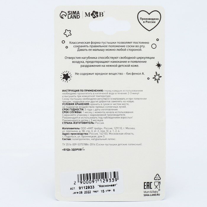 Mum&Baby Соска-пустышка классическая, от 3 мес., латекс, "Космонавт" интересное: