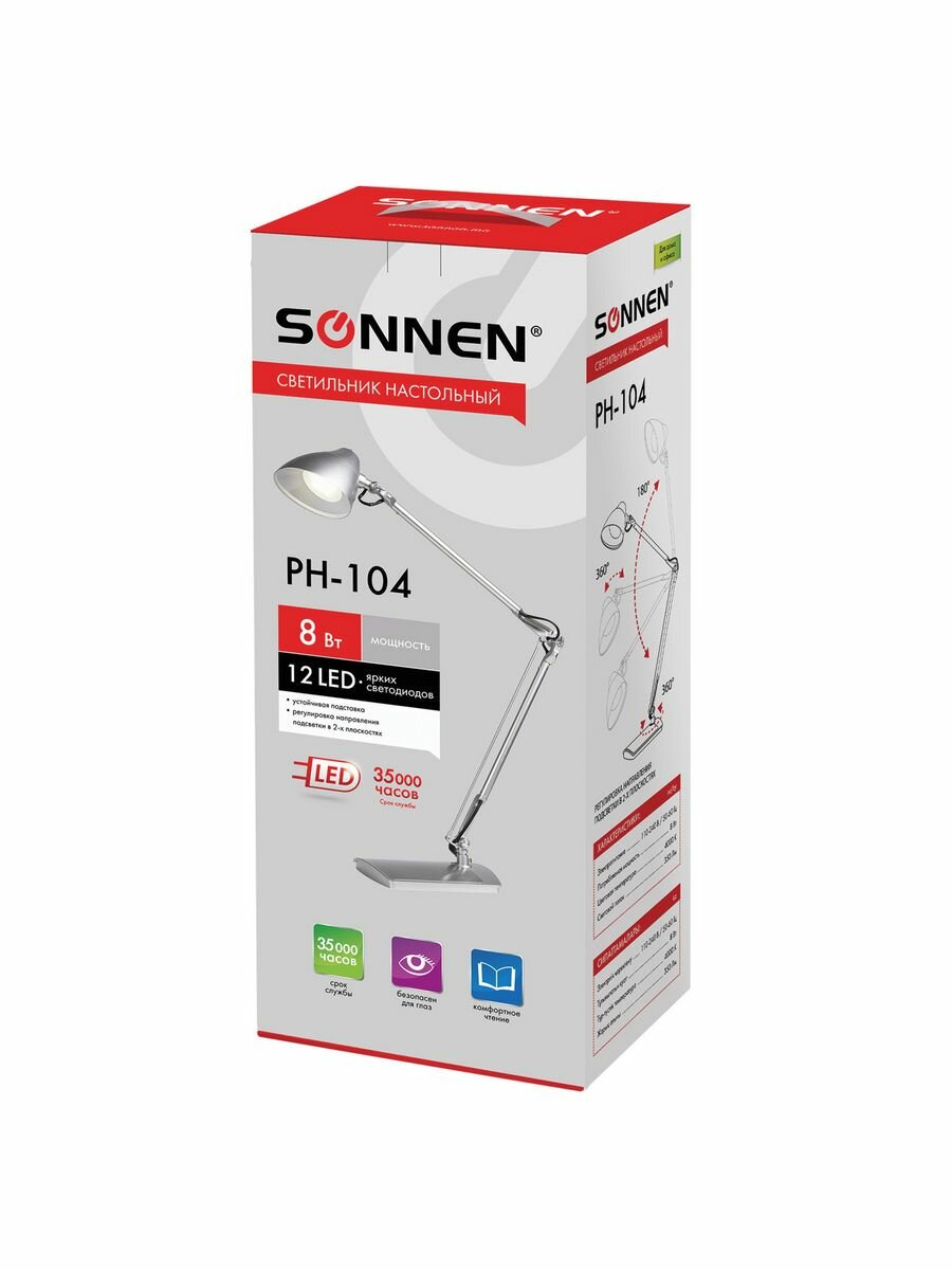 Настольная лампа-светильник SONNEN PH-104, подставка, LED, 8 Вт, металлический корпус, серый, 236691 (236691)