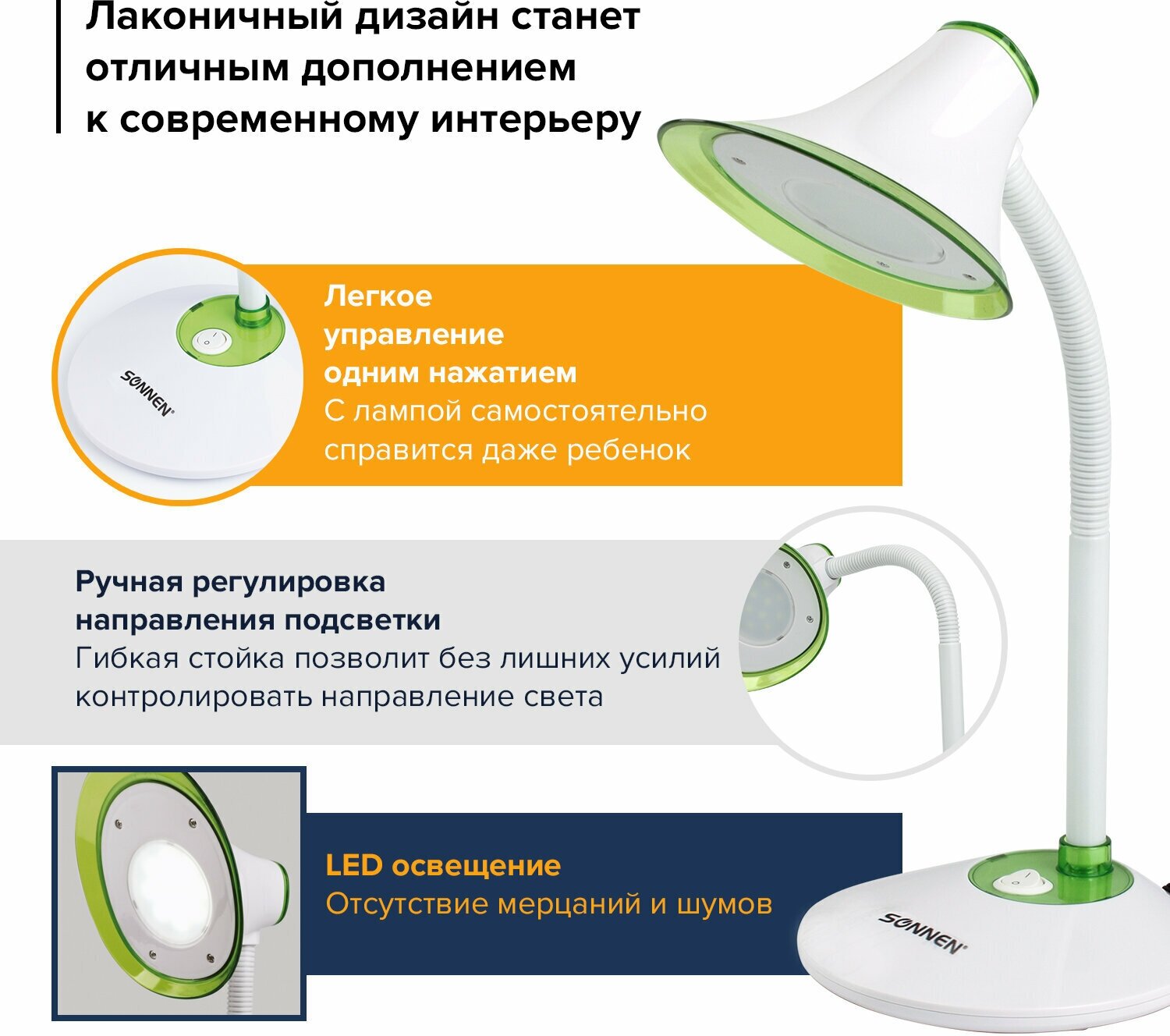 Светильник настольный SONNEN OU-608, на подставке, светодиодный, 5 Вт, белый/зеленый