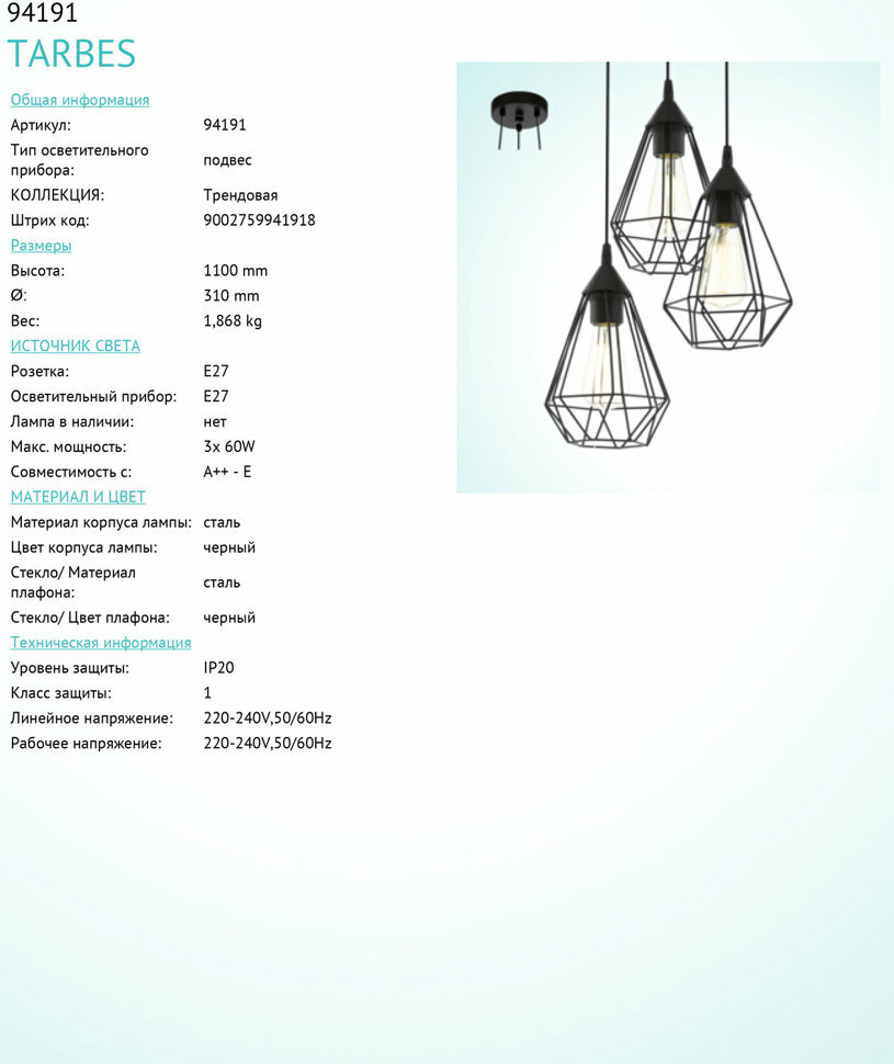 Ниже Вы можете прочитать отзывы на Подвесный светильник Eglo 94191 TARBES, ознакомится с подробными характеристиками, посмотреть интересные обзоры и фотографии на Подвесный светильник Eglo 94191 TARBES.