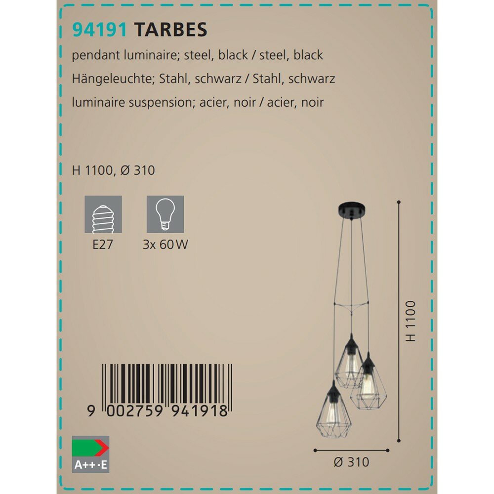 94191 Подвес TARBES, 3x60W (E27), Ø310, Н1100, сталь, пластик, черный