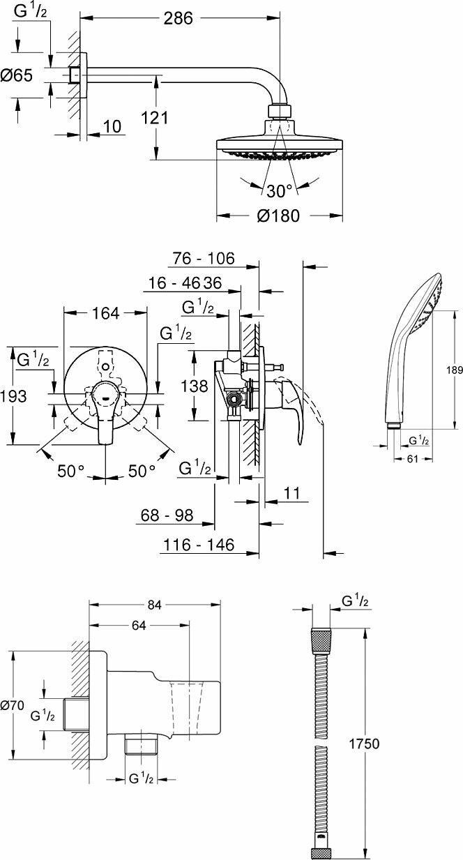 | Комплектация | верхний душ GROHE Tempesta 210 с душевым кронштейном 286 мм - 1 шт. / ручной душ GROHE Euphoria Mono (1 режим) - 1 шт. / душевой шланг GROHE Relexaflex 1750 мм - 1 шт. / смеситель для ванны GROHE Eurosmart New (внешняя и встраиваемая части) |