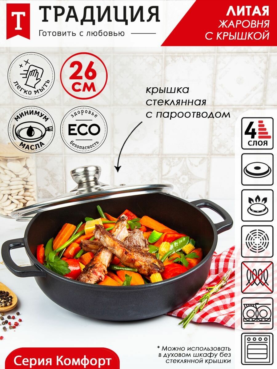 Сковорода-жаровня Традиция Комфорт литая со стеклянной крышкой, с крышкой, диаметр 26 см