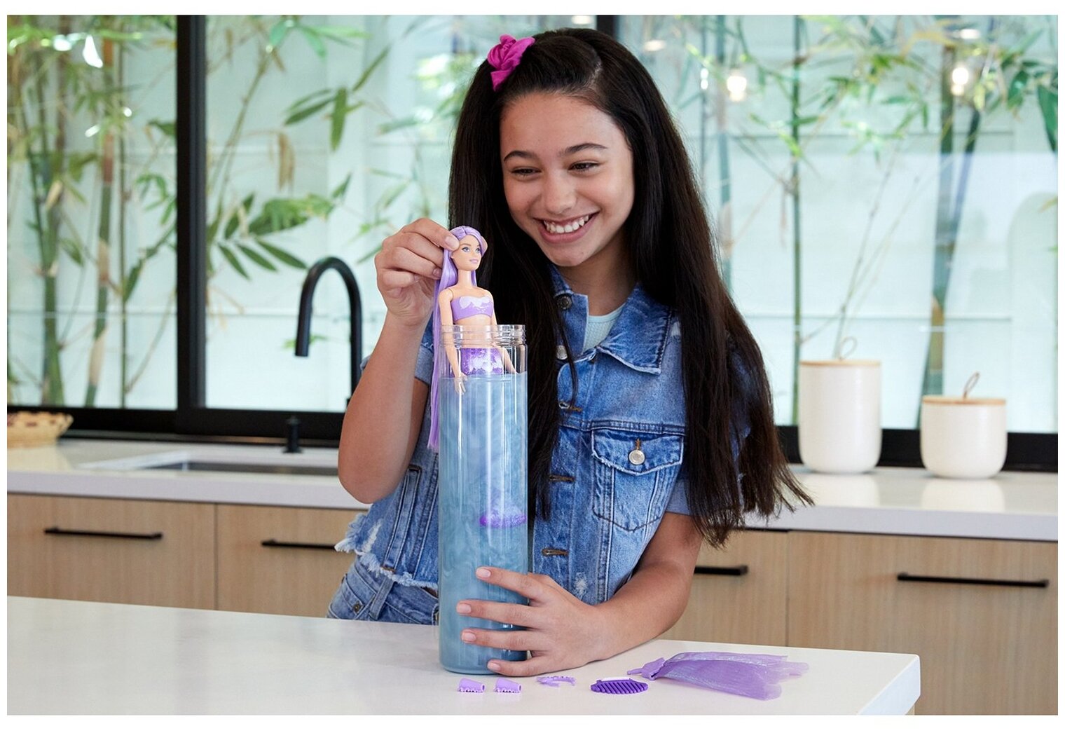 | Комплектация | кукла, 4 пакетика-сюрприза - это 4 аксессуара: мягкий плавник, который крепится к хвосту, пара браслетов, тиара и губка-гребешок в форме морской ракушки |