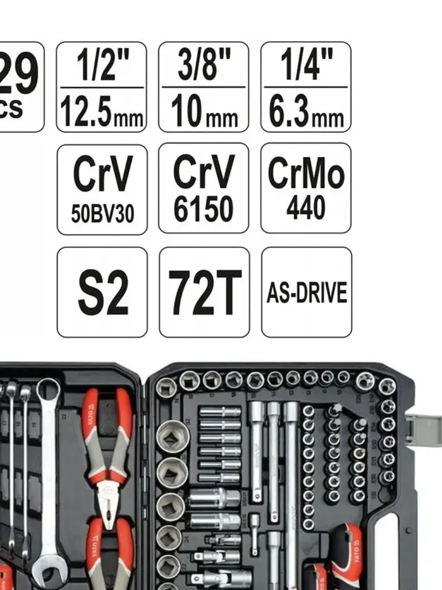 Купить Набор инструмента YATO 129 предм, 1/4'', 1/2'', 3/8'', CrV, CrMo, 72T, S2, AS-DRIVE, YT-38881 Отличный подарок