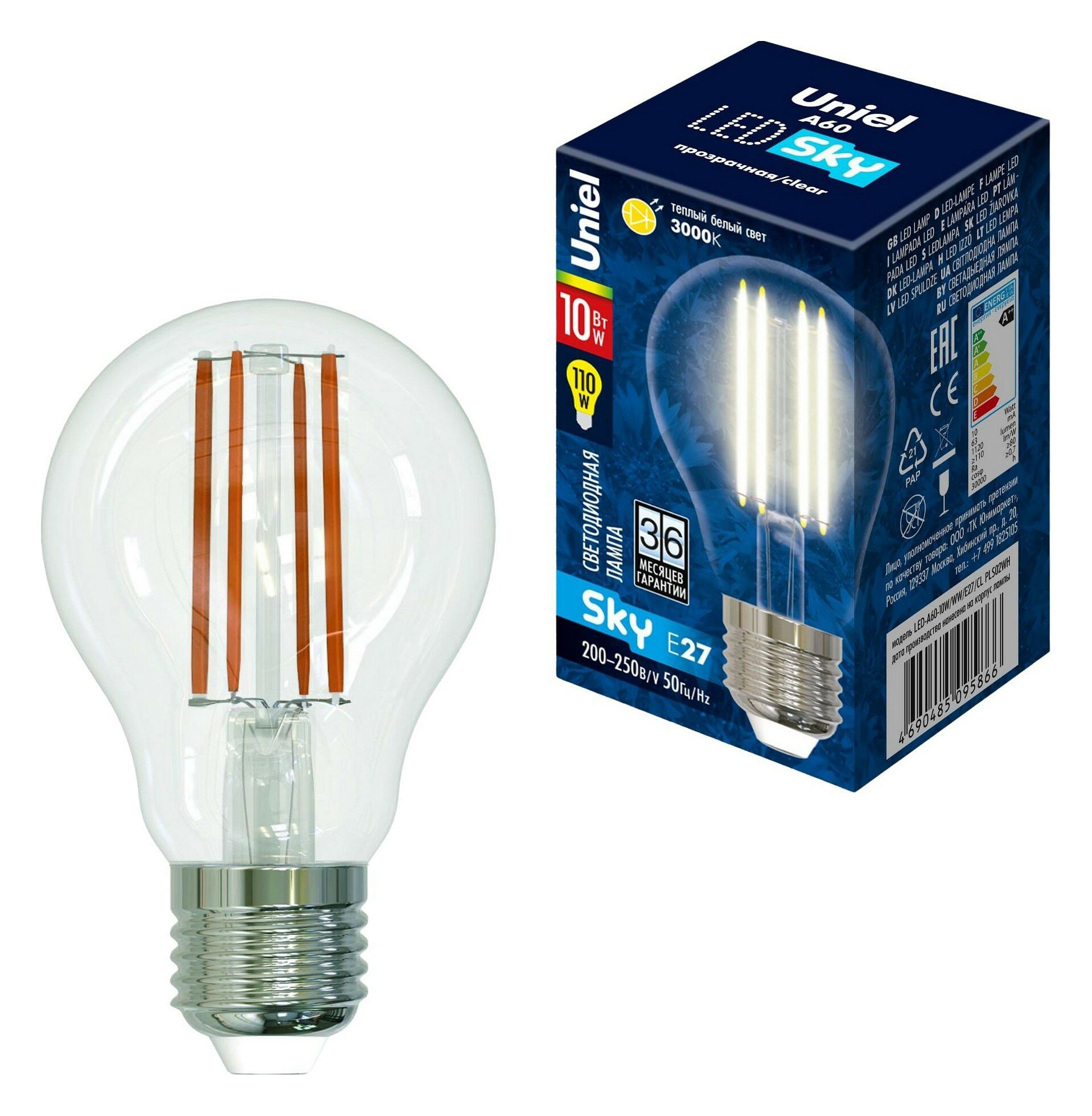 Лампа светодиодная Uniel. Филаментная. Форма A. Прозрачная. Серия Sky. Дневной белый свет 4000K. Цоколь e27. LED-A60-10W-NW-E27-CL PLS02WH