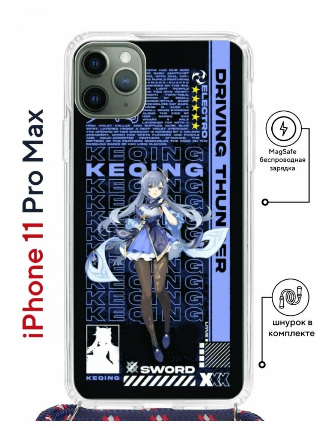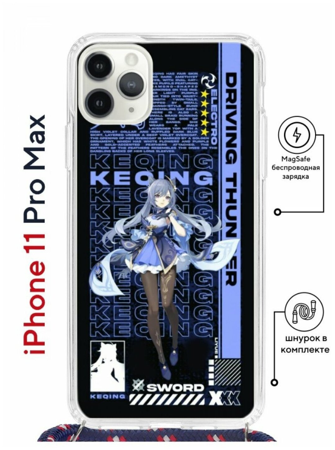 Купить Чехол для iPhone 11 Pro Max Kruche Print MagSafe Magrope Genshin Keqinq,противоударная пластиковая накладка,защитный силиконовый бампер со шнурком
