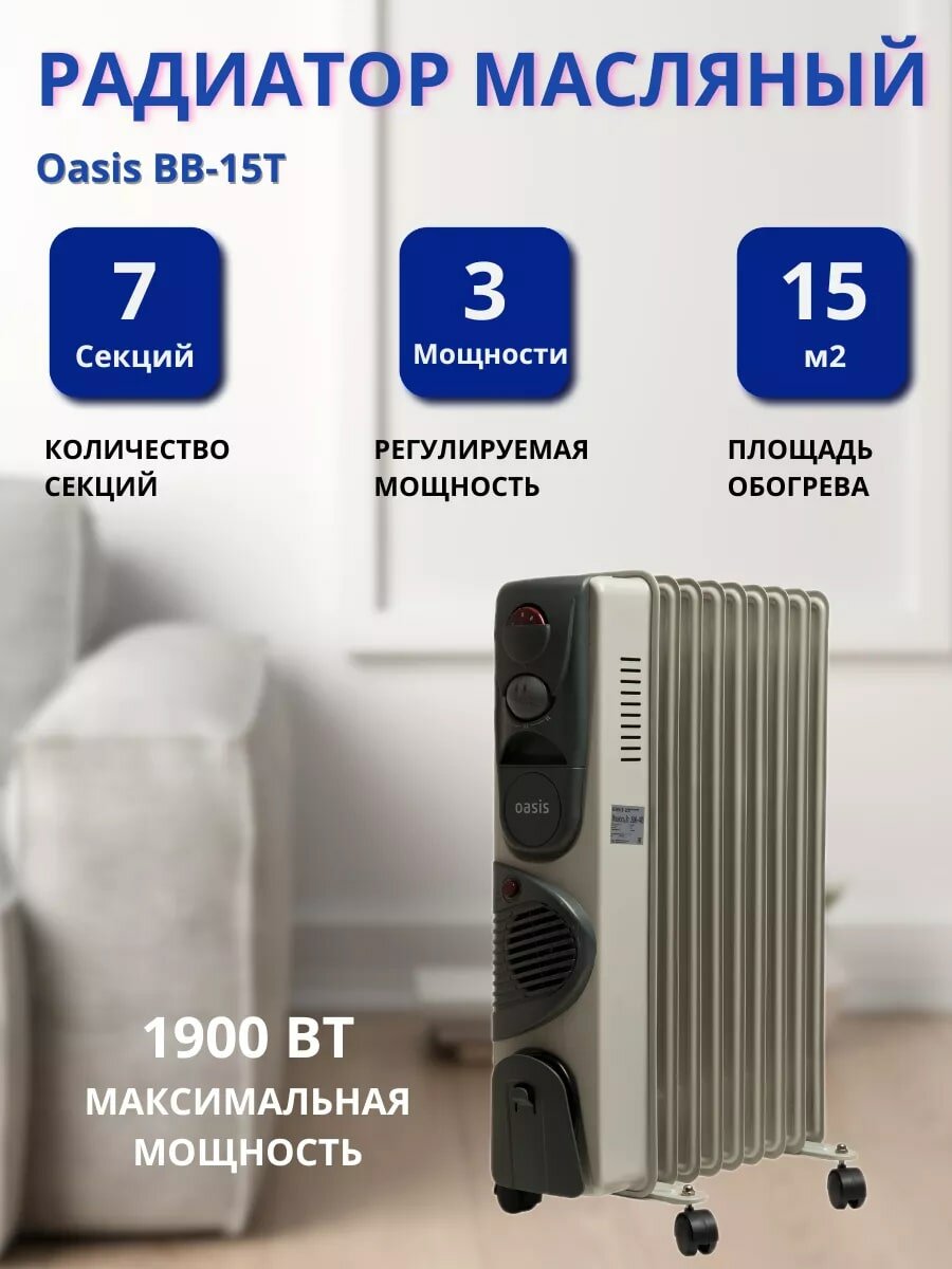 Радиатор масляный Oasis BВ-15Т, 7 секций 1500Вт+400Вт, тепловентилятор
