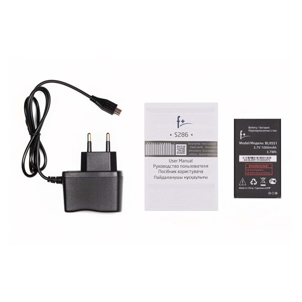 | Комплектация | телефон F+ S286, аккумуляторная батарея, зарядное устройство, руководство пользователя, гарантийный талон |