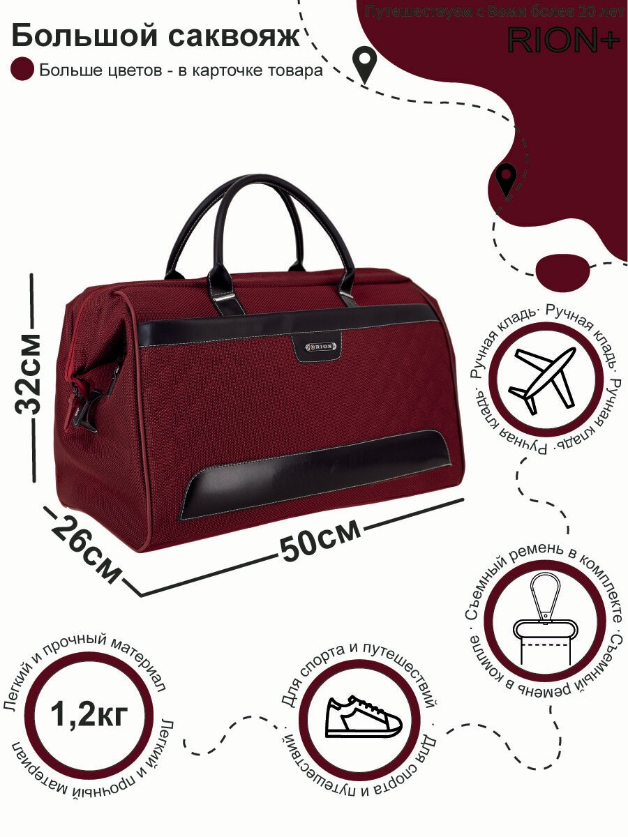 СохранитьСумка дорожная для путешествий и спорта Рион+ (RION+) R232, 42 литра, саквояж, ручная кладь для самолета / поезда / авто, (до 25кг), бордовый интересное: