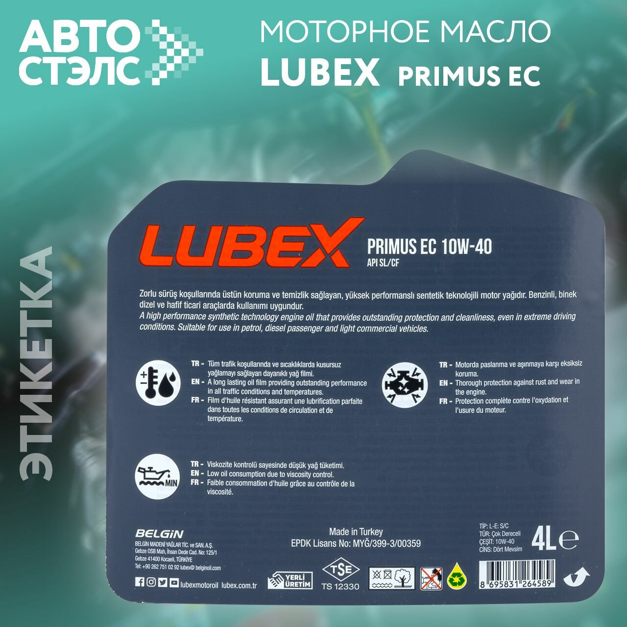 Масло моторное 10W40 LUBEX 4л синтетика PRIMUS EC API SL/CF L034-1302-0404 LUBEX