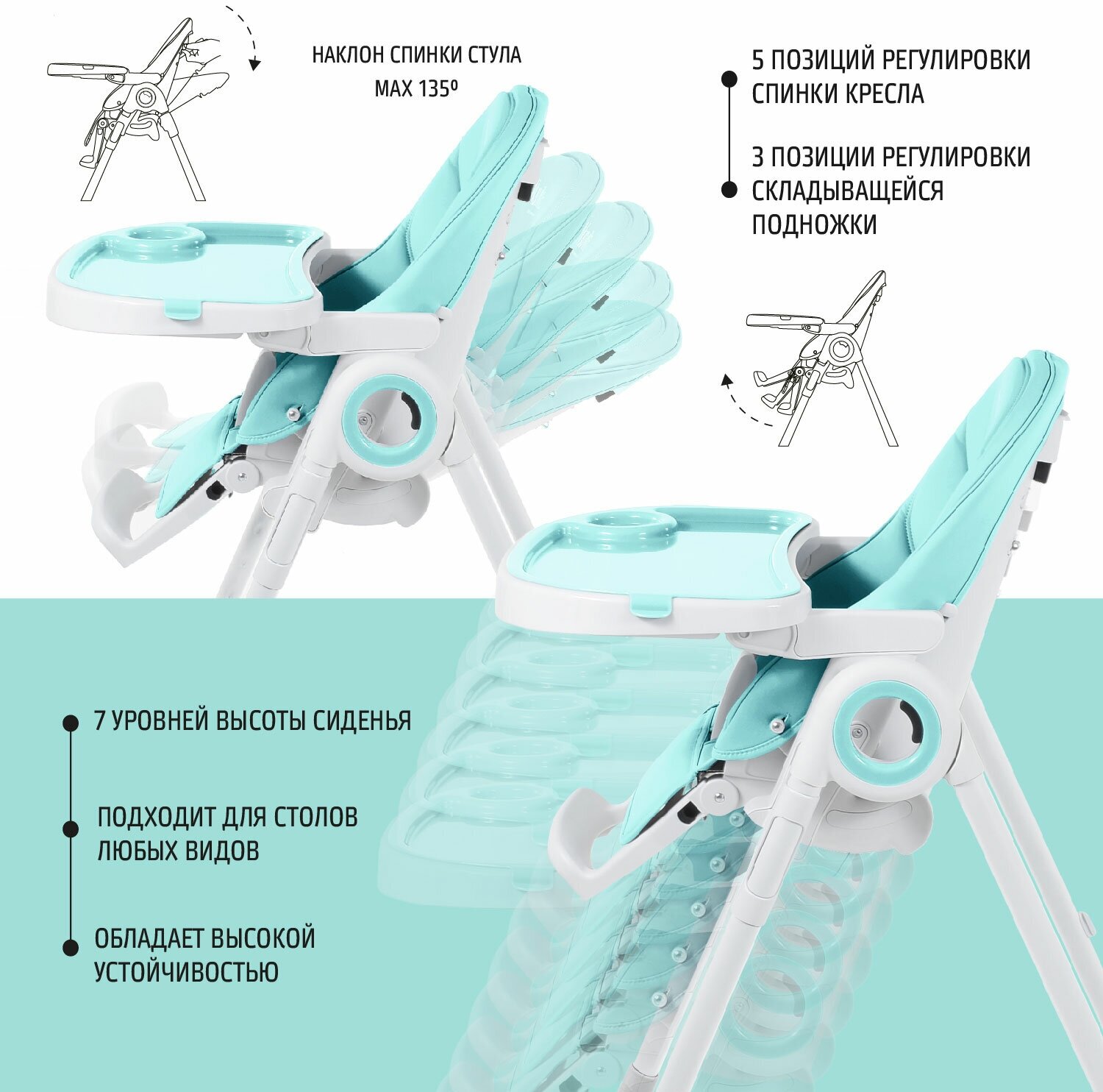 | Регулировка | высоты стульчика / наклона спинки / положения столика / положения подножки |