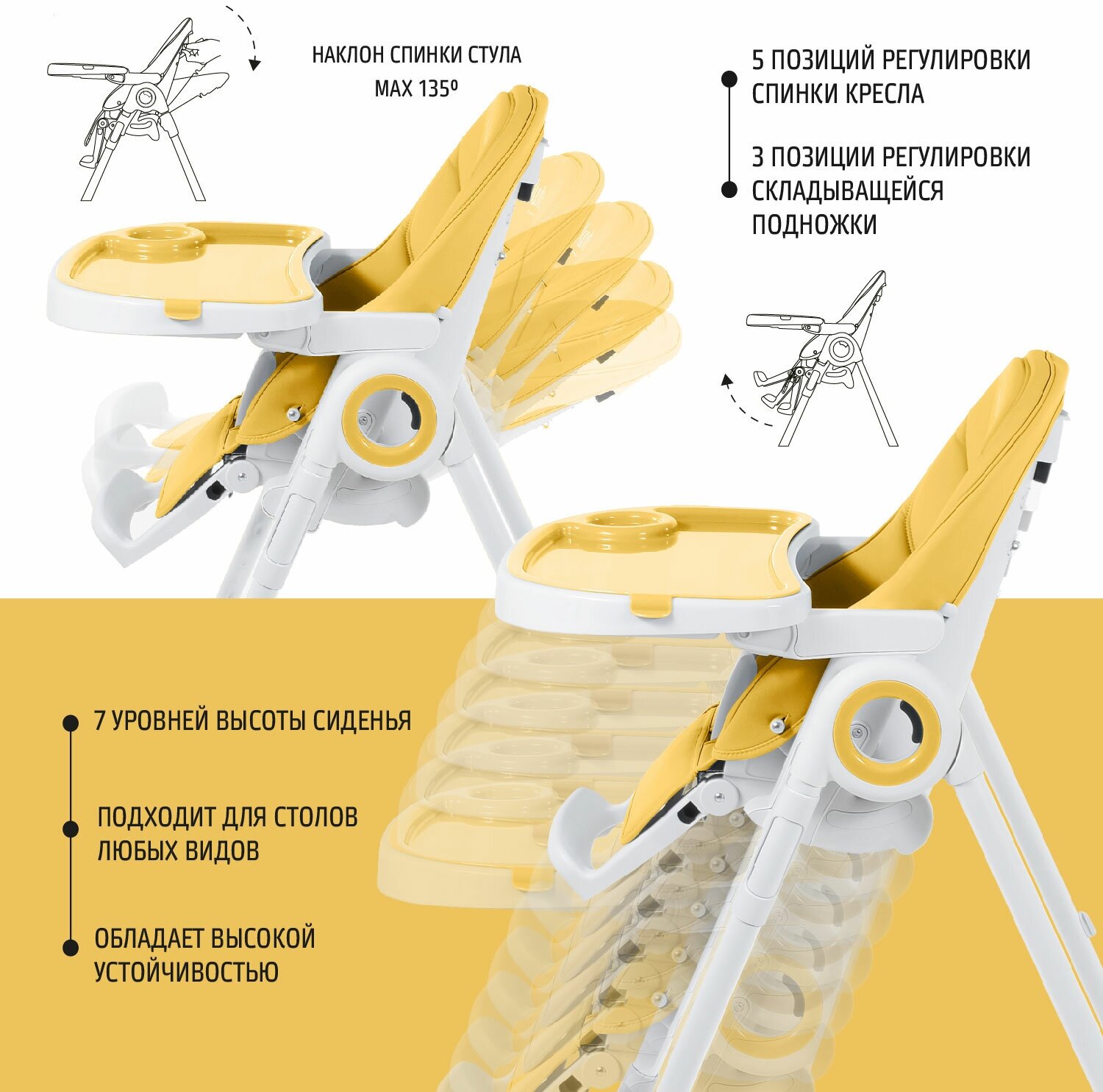 | Регулировка | высоты стульчика / наклона спинки / положения столика / положения подножки |