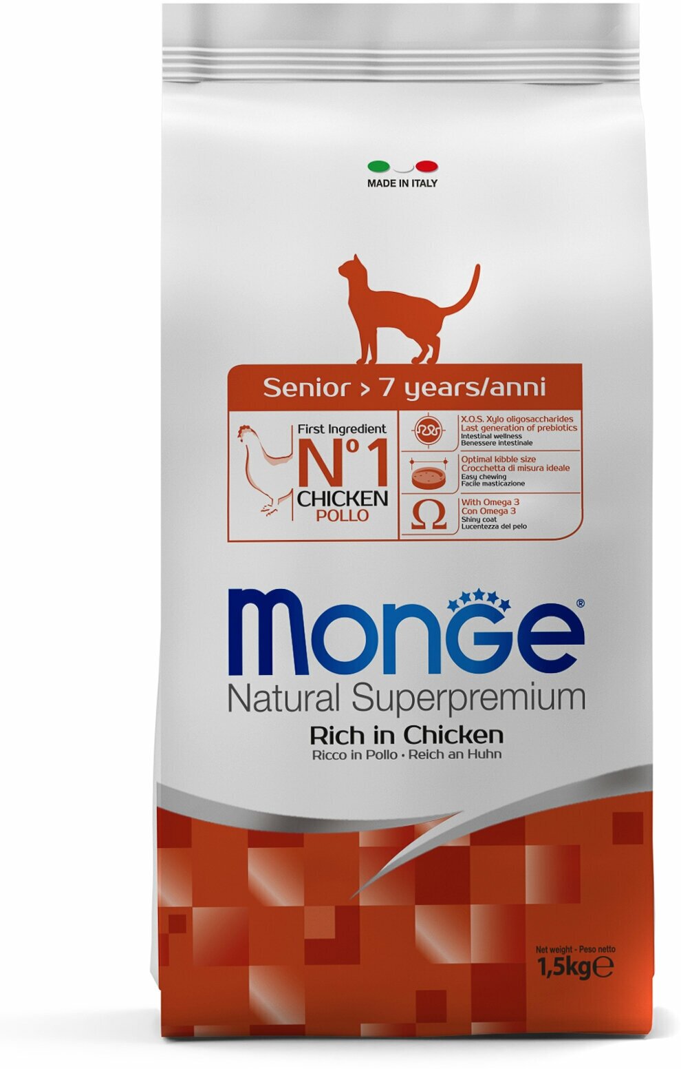 Сухой корм для пожилых кошек Monge Superpremium Cat, для здоровья кожи и блеска шерсти, профилактика зубного камня, с курицей 1.5 кг
