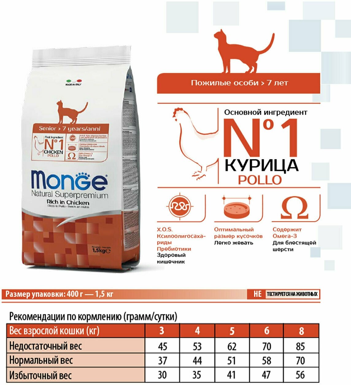 Ниже Вы можете прочитать отзывы на Сухой корм для пожилых кошек Monge Superpremium Cat, для здоровья кожи и блеска шерсти, профилактика зубного камня, с курицей 8 шт. х 400 г, ознакомится с подробными характеристиками, посмотреть интересные обзоры и фотографии на Сухой корм для пожилых кошек Monge Superpremium Cat, для здоровья кожи и блеска шерсти, профилактика зубного камня, с курицей 8 шт. х 400 г.