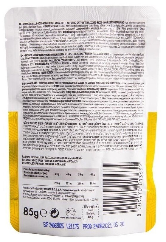 Корм для кошек MONGE Cat Grill Pouch для стерилизованных кошек итальянская курица пауч 85г (упаковка - 28 шт)