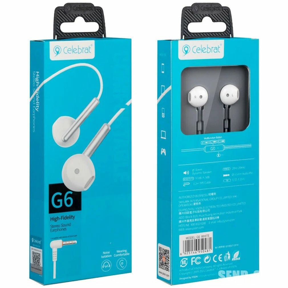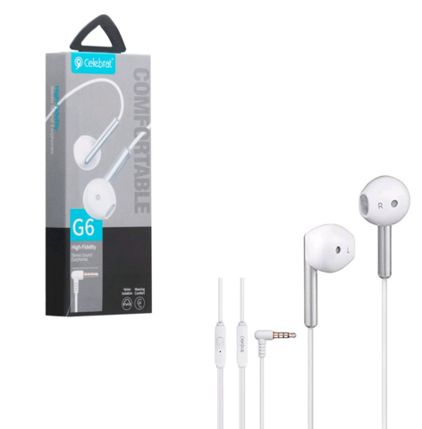 Наушники внутриканальные с микрофоном Celebrat G6,белые 3.5mm Audio Pin, 1,2m