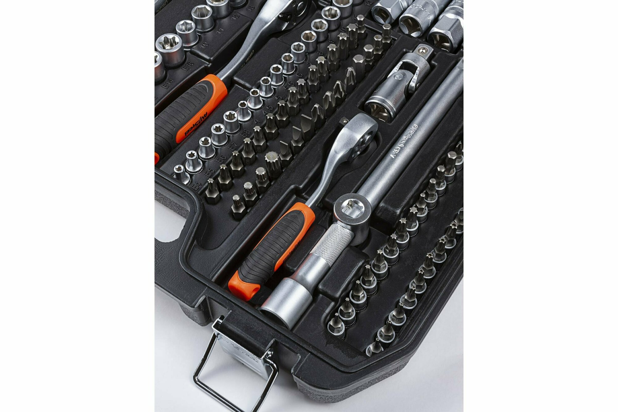 | Ручной инструмент подробно | трещотка 1/2": 72 зуба; удлинитель 1/2": 125, 250 мм; трещотка 3/8": 72 зуба; удлинитель 3/8": 125 мм; трещотка 1/4": 72 зуба; удлинитель 1/4": 50, 100 мм; вороток т-образный 1/4": 115 мм |