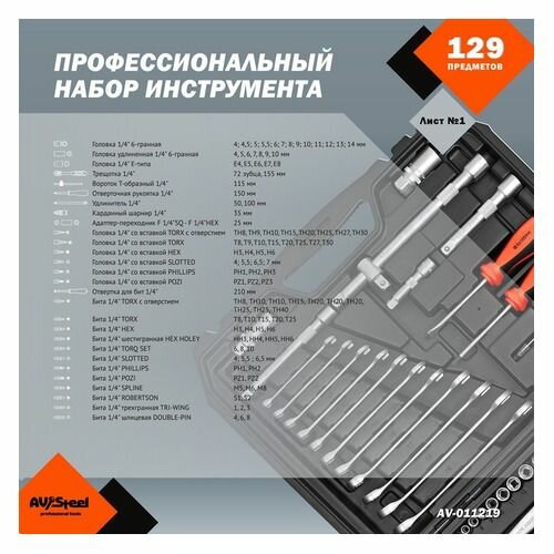 AV Steel AV-011219 Набор инструмента 1/4", 3/8", 1/2", 6 и 12 гр. 219 пр.