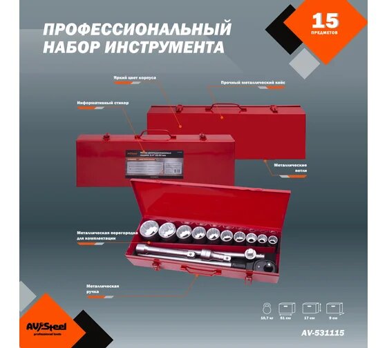 Набор профессионального инструмента AV Steel 15 предметов 3/4 в мет. кейсе AV-531115 интересное: