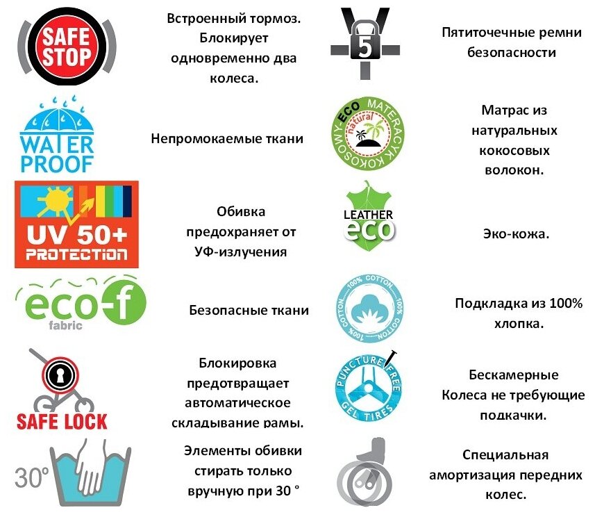 | Аксессуары в комплекте | матрас, сумка, адаптеры для крепления автокресла, бампер, накидка на ноги, дождевик, рюкзак, антимоскитная сетка, подстаканник, муфта для рук, солнцезащитный козырек |