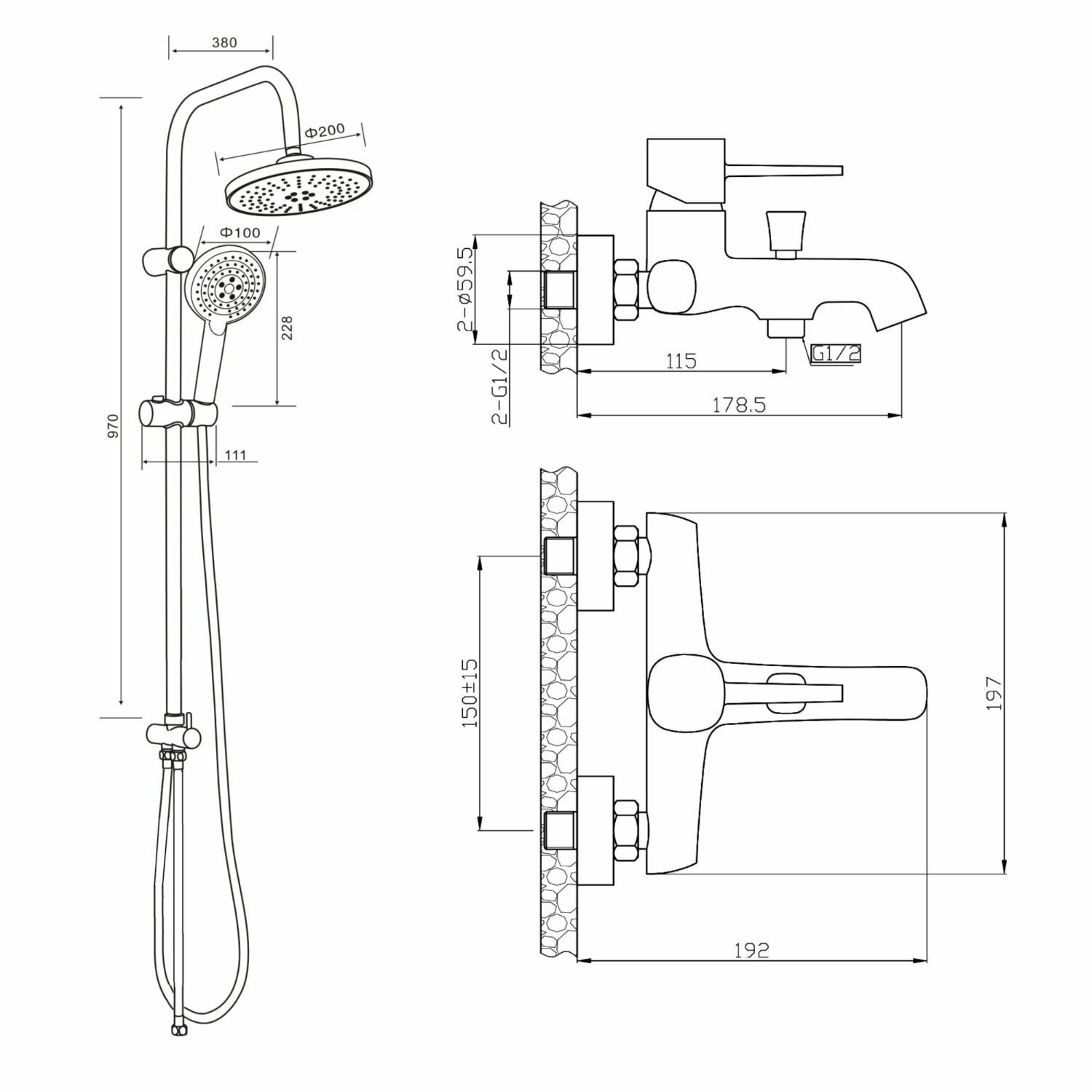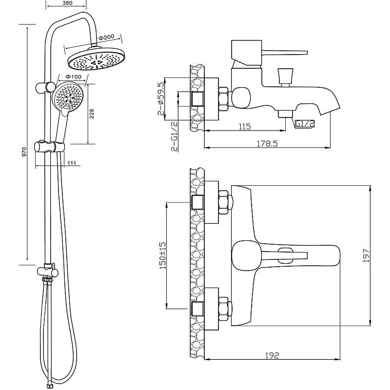 | Комплектация | Верхний душ;Держатель для лейки;Душевая лейка;Душевая штанга;Смеситель;Шланг для душа;Шланговое подключение |