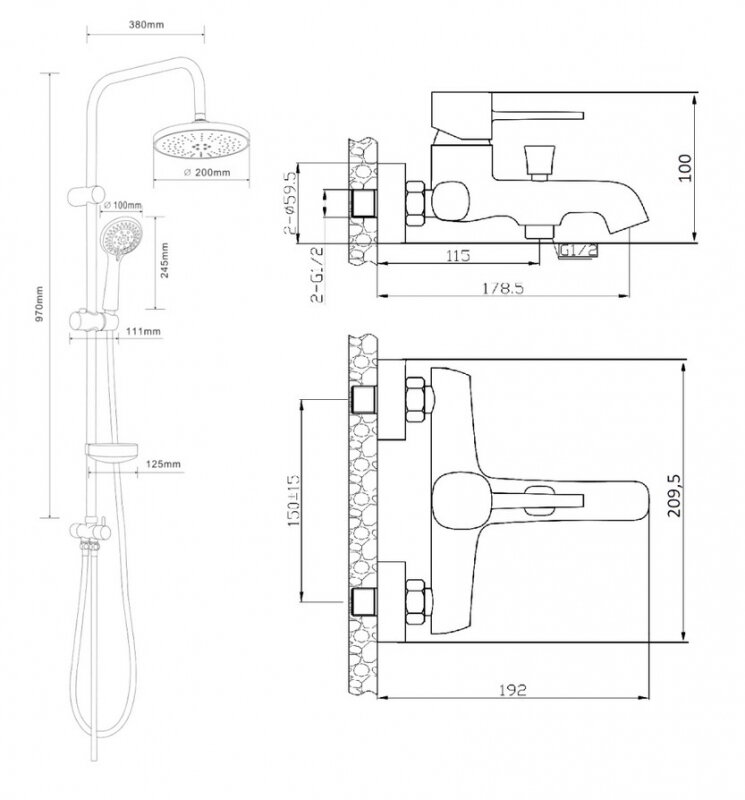 | Комплектация | Верхний душ;Держатель для лейки;Душевая лейка;Душевая штанга;Смеситель;Шланг для душа;Шланговое подключение |