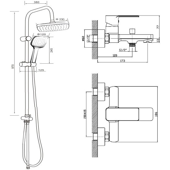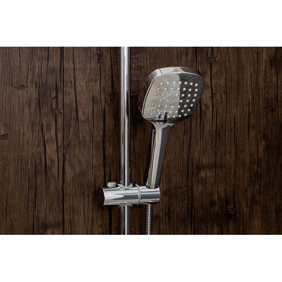 | Комплектация | верхний душ / шланг для душа / смеситель с изливом / душевая лейка / душевая штанга / держатель лейки / держатель штанги / эксцентрики / инструкция |
