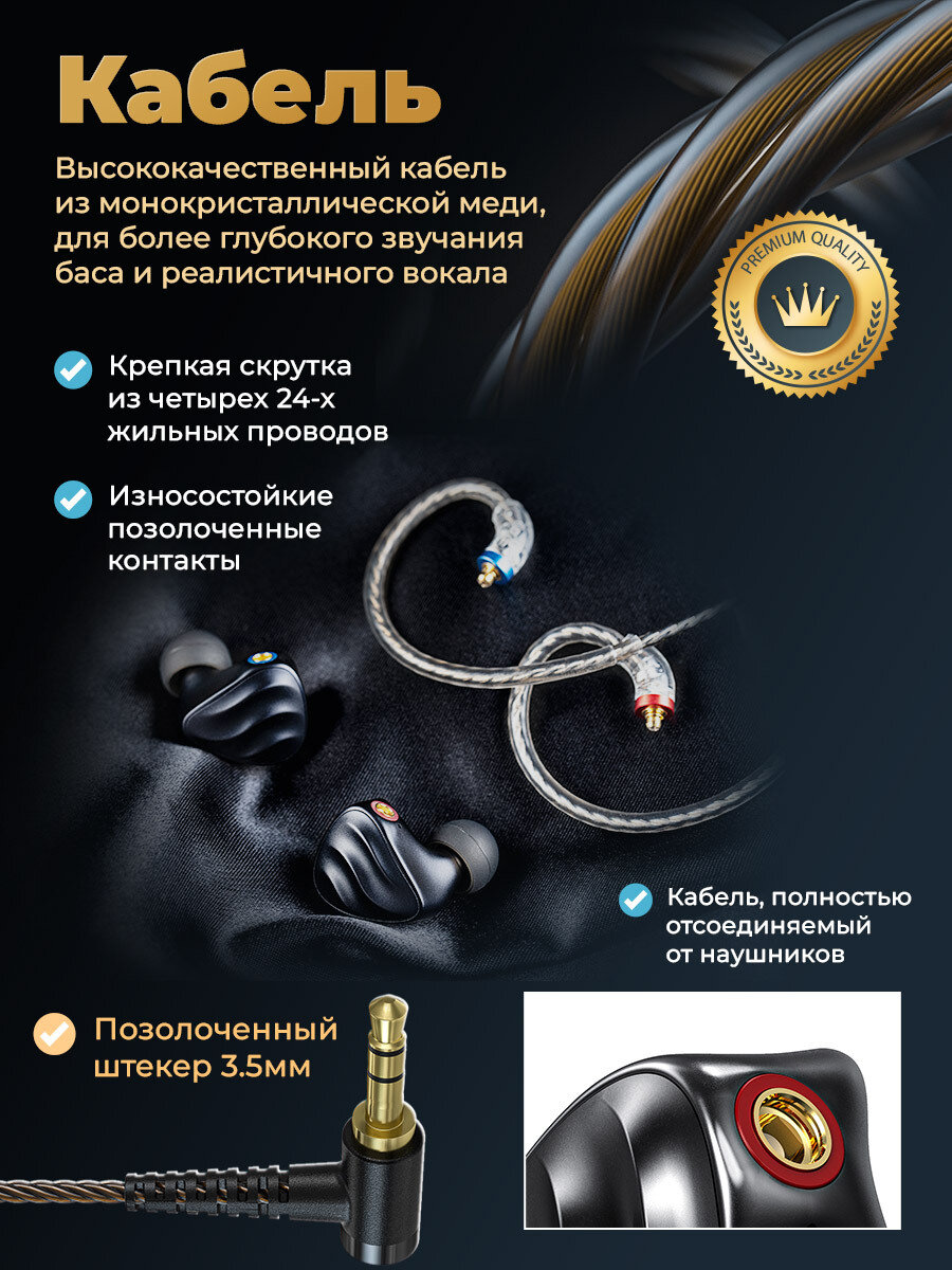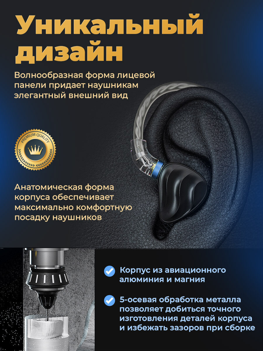 - металлический корпус, - провод почти без микрофонного эффекта, - цена считаю очень хорошая для такого качества, фактически получаете качество свойственное более дорогому ценовому сегменту, - mmcx. |