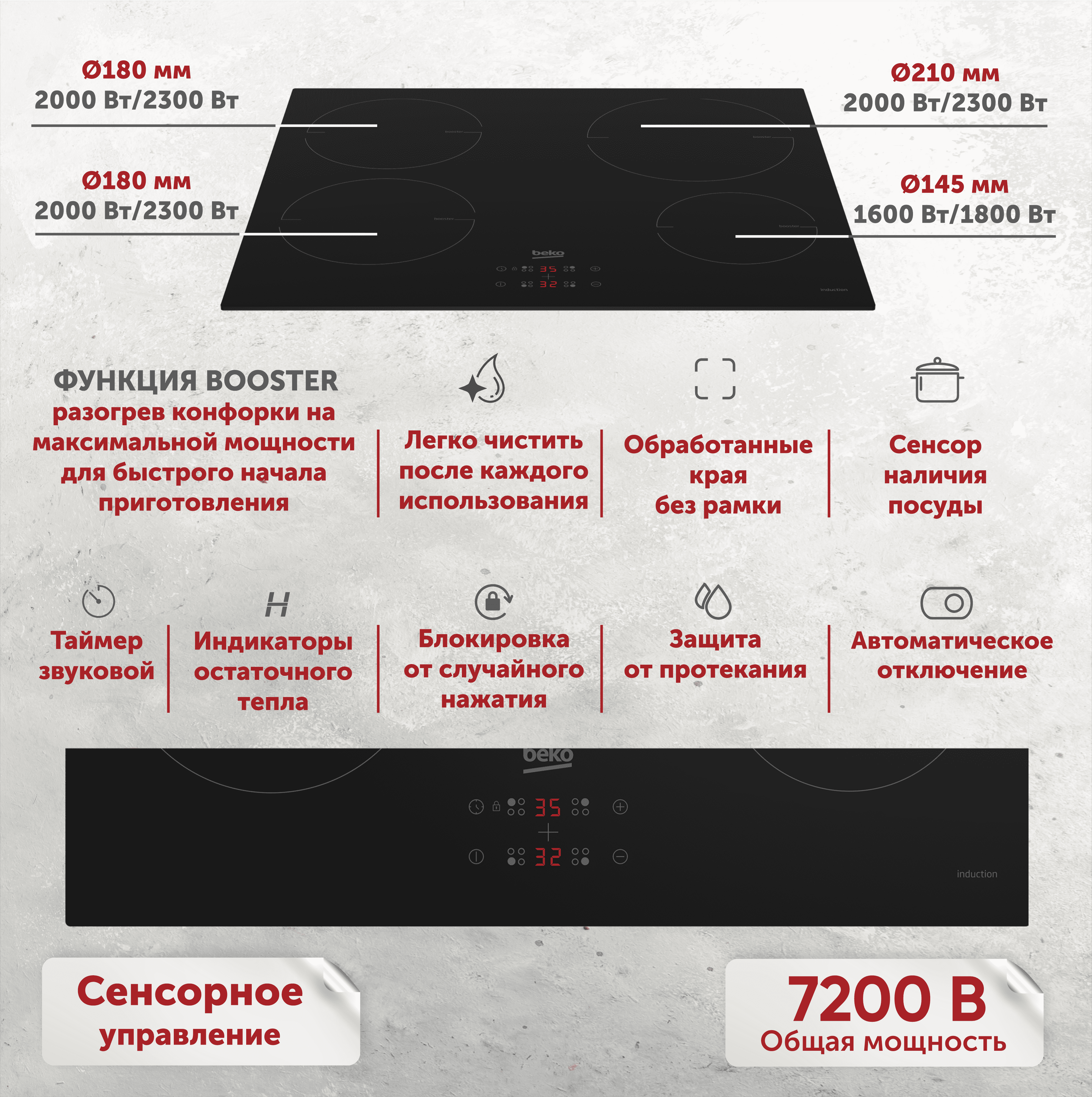 | Плюсы: | Сенсорное управление, 4 зоны для разной посуды, индукционная, 9 уровней нагрева |