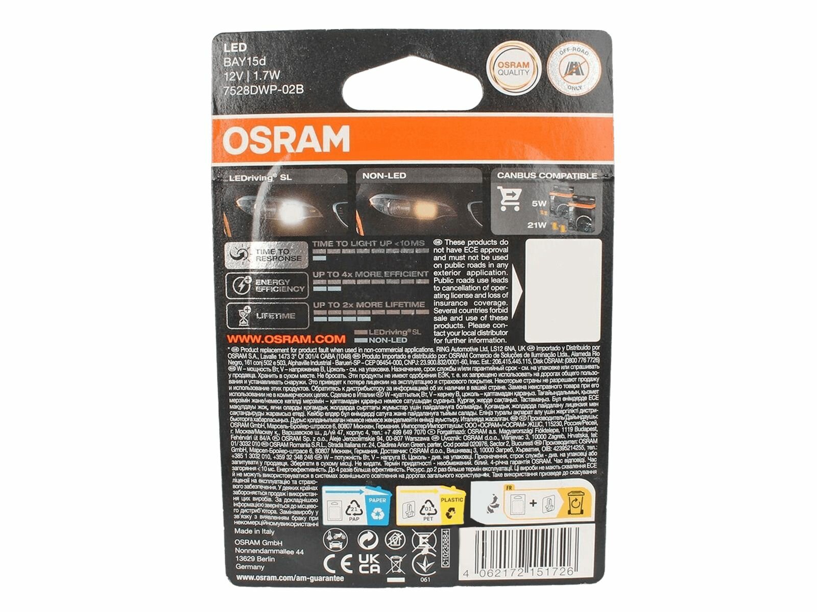 Лампа Led P21/5W 1,7W 12V Bay15d (Блистер 2 Шт) Osram арт. 7528DWP-02B