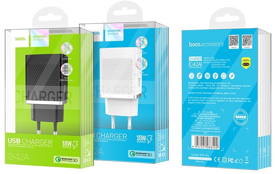 Сетевое зарядное устройство (СЗУ) Hoco C42A QC 3.0 (USB) 3 А, черный
