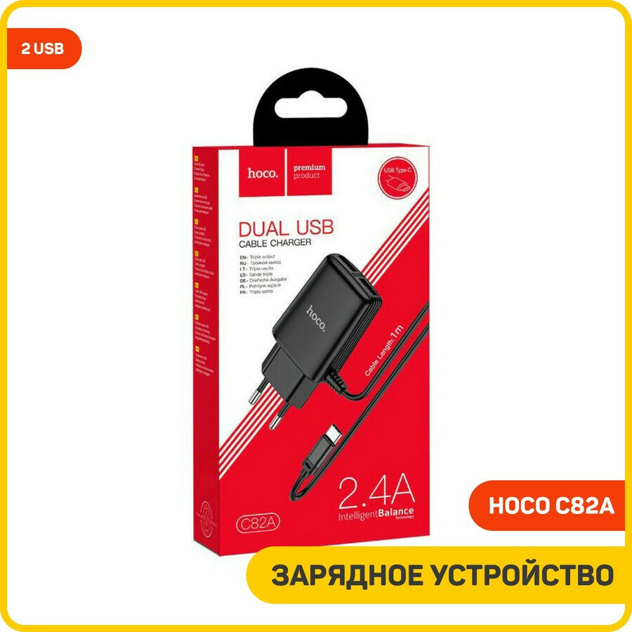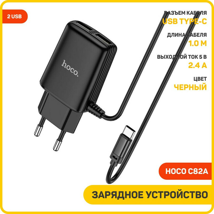 Купить Сетевое зарядное устройство (СЗУ) Hoco C82A (2 USB) + кабель Type-C, 2.4 А, черный